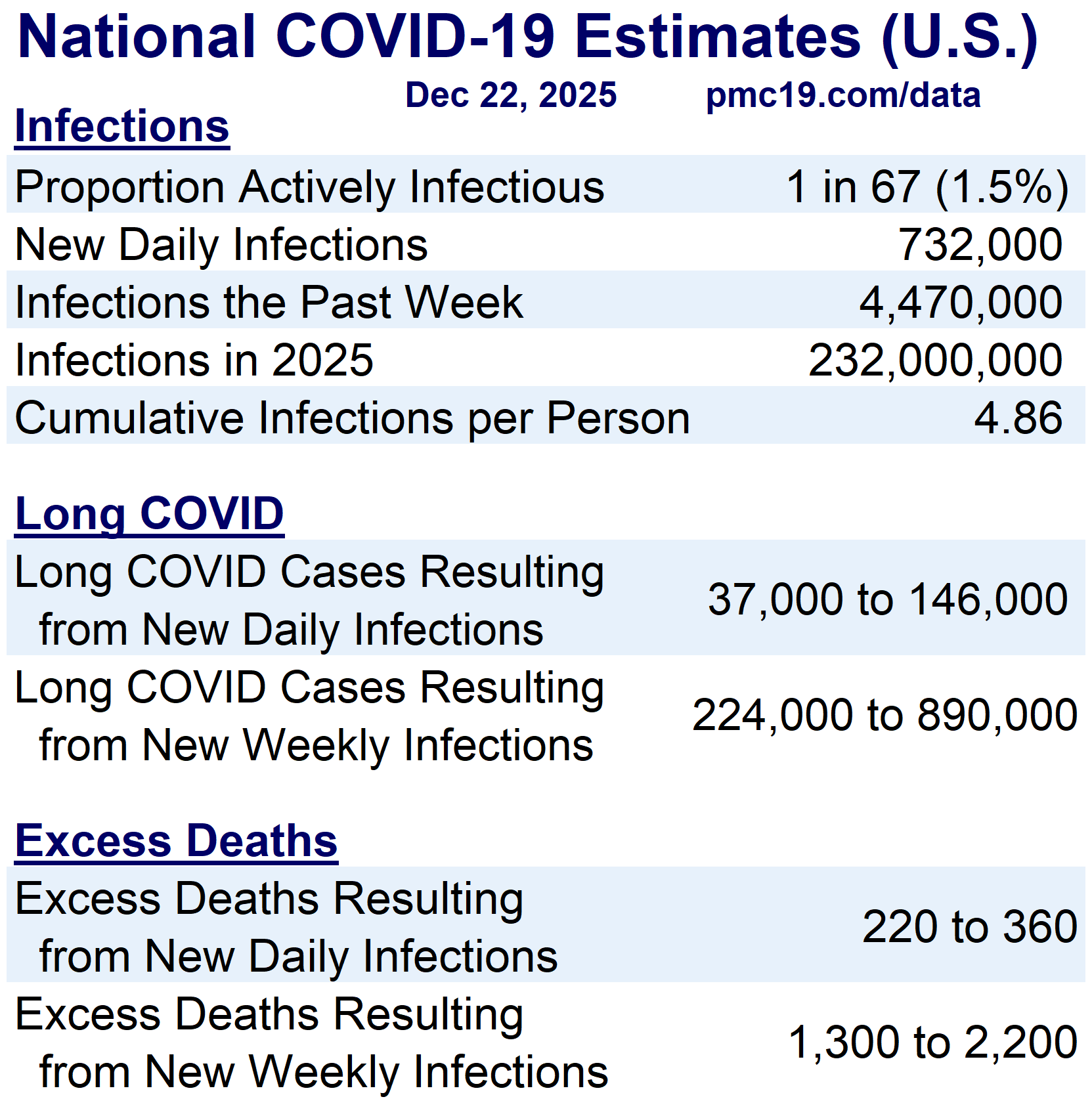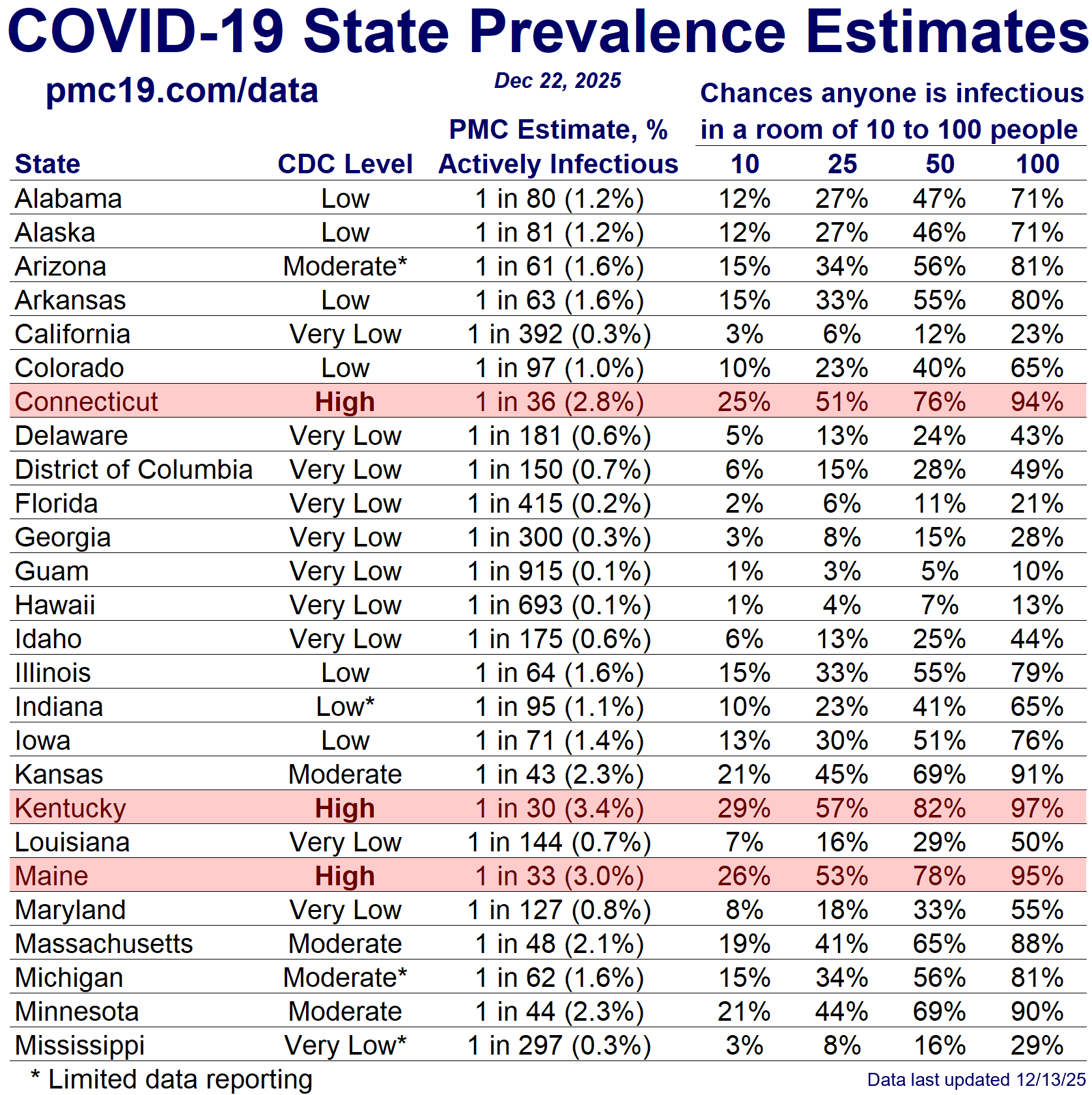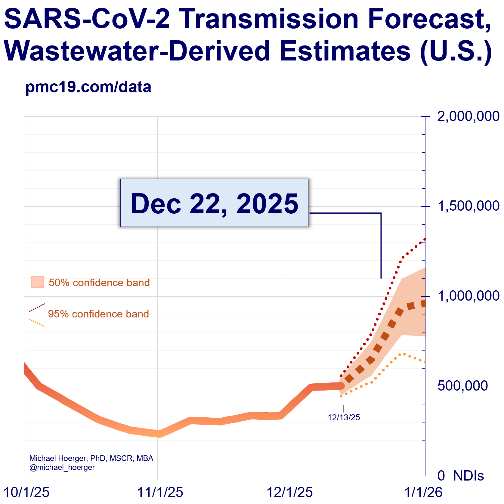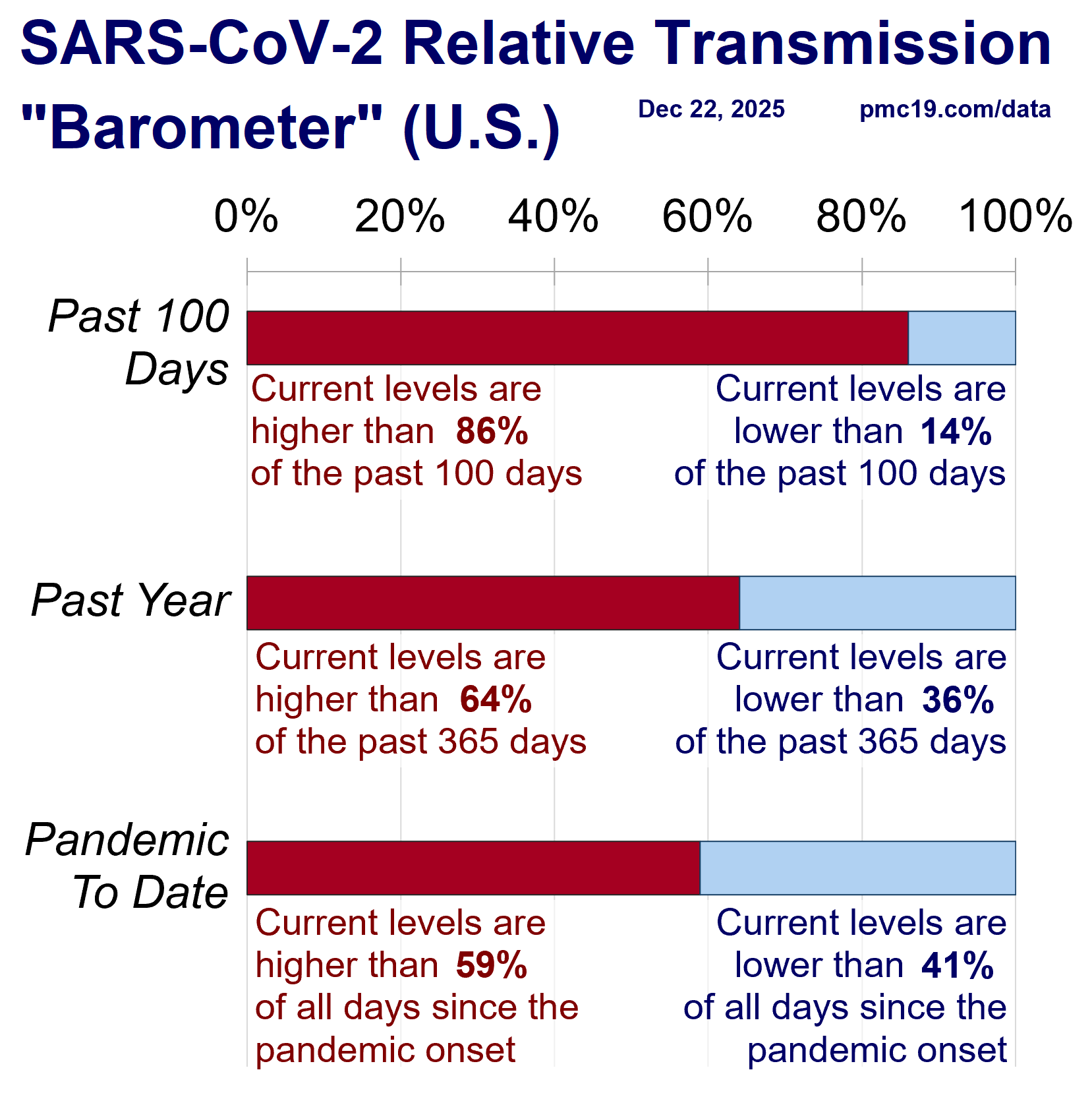 Transmission is increasing rapidly nationally amid the 12th COVID-19 wave in the U.S. The most recent reliable data are through December 13 and show moderate to low relative levels, but CDC and PMC forecasts suggest rapid increases in transmission from December 13 to 31. This discrepancy between known and forecasted levels suggests that many people will get "surprise" SARS-CoV-2 infections over the next 4 weeks.