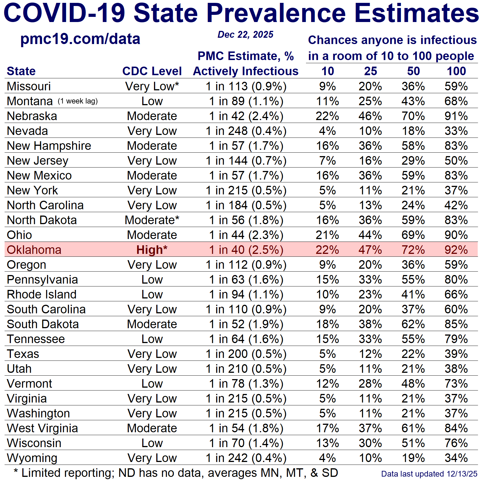 - Oklahoma: CDC Oklahoma | WastewaterSCAN Oklahoma (N/A)