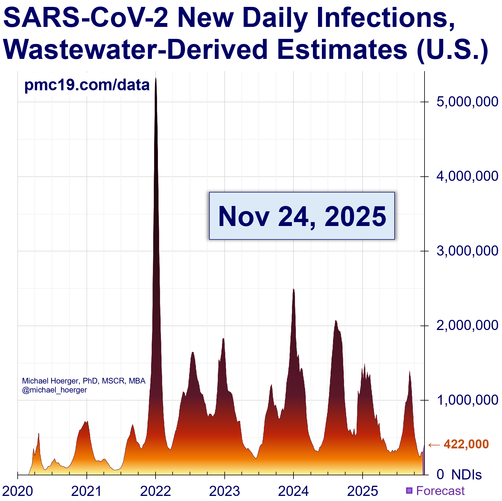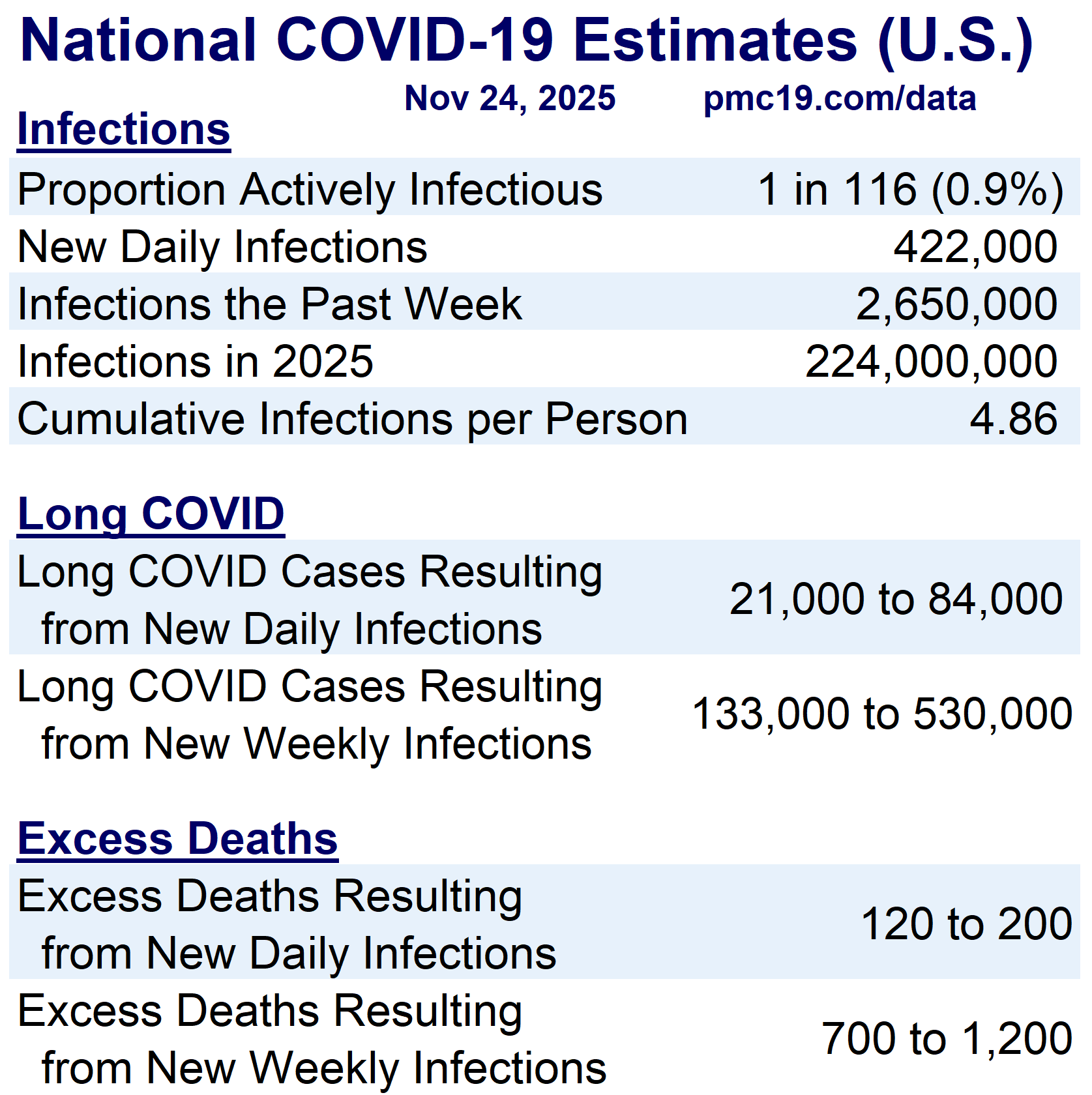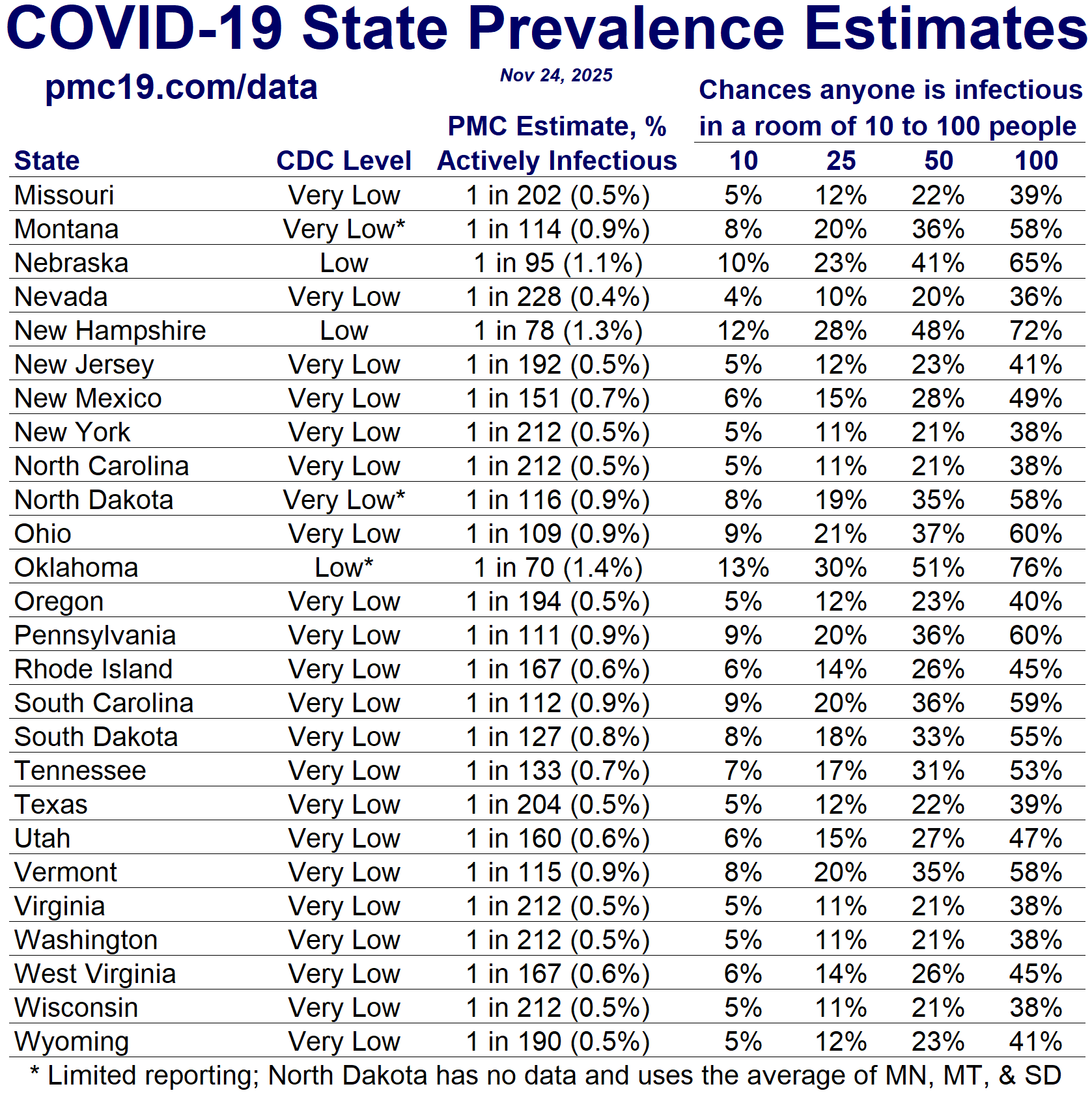(Next report on Dec 2)All data are back online. Note that state-level estimates are likely underestimates, as they are based on the most recent data, which are over a week old. National estimates incorporate the forecasting model, which projects higher levels based on the typical increases observed in late November.