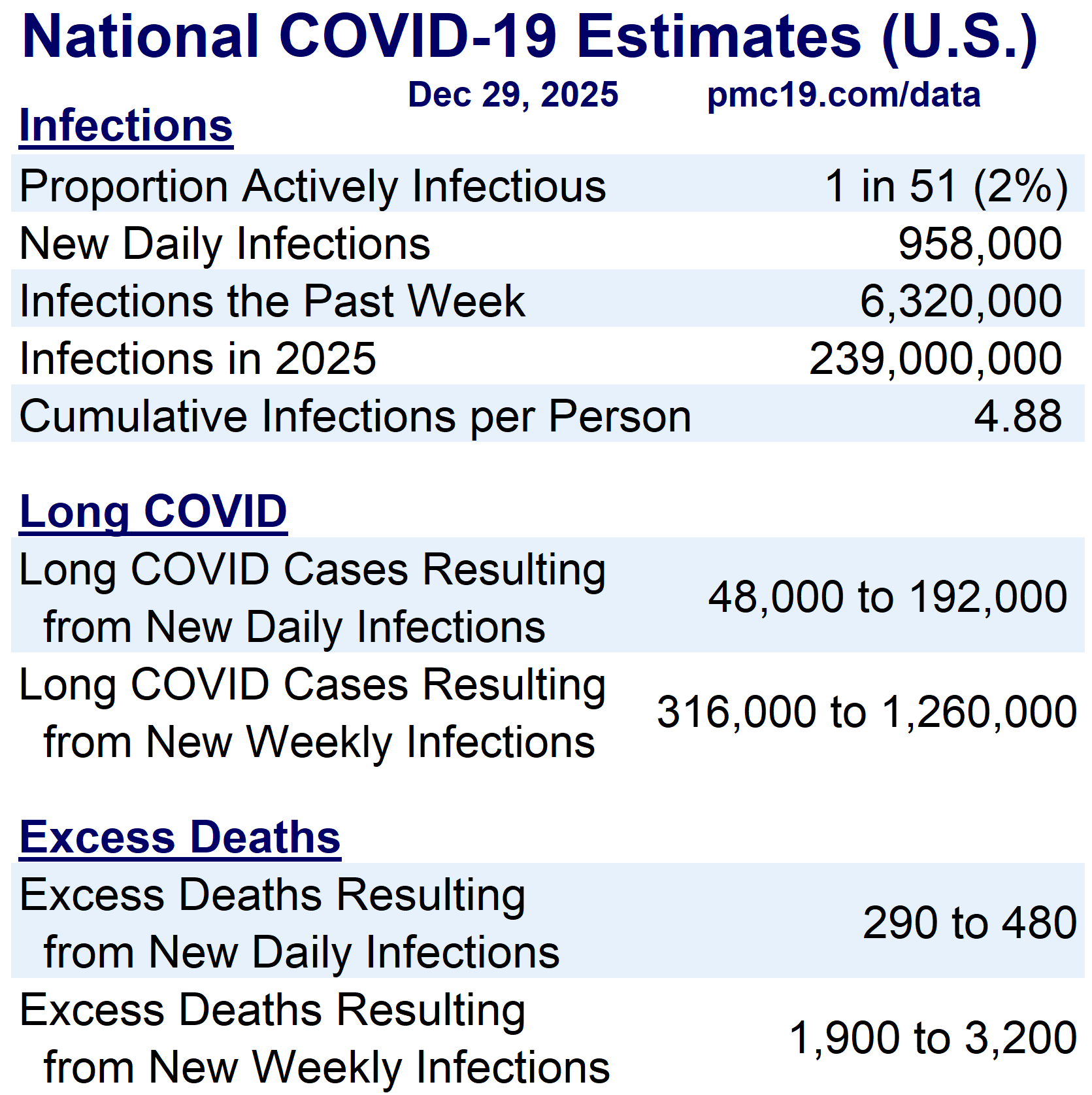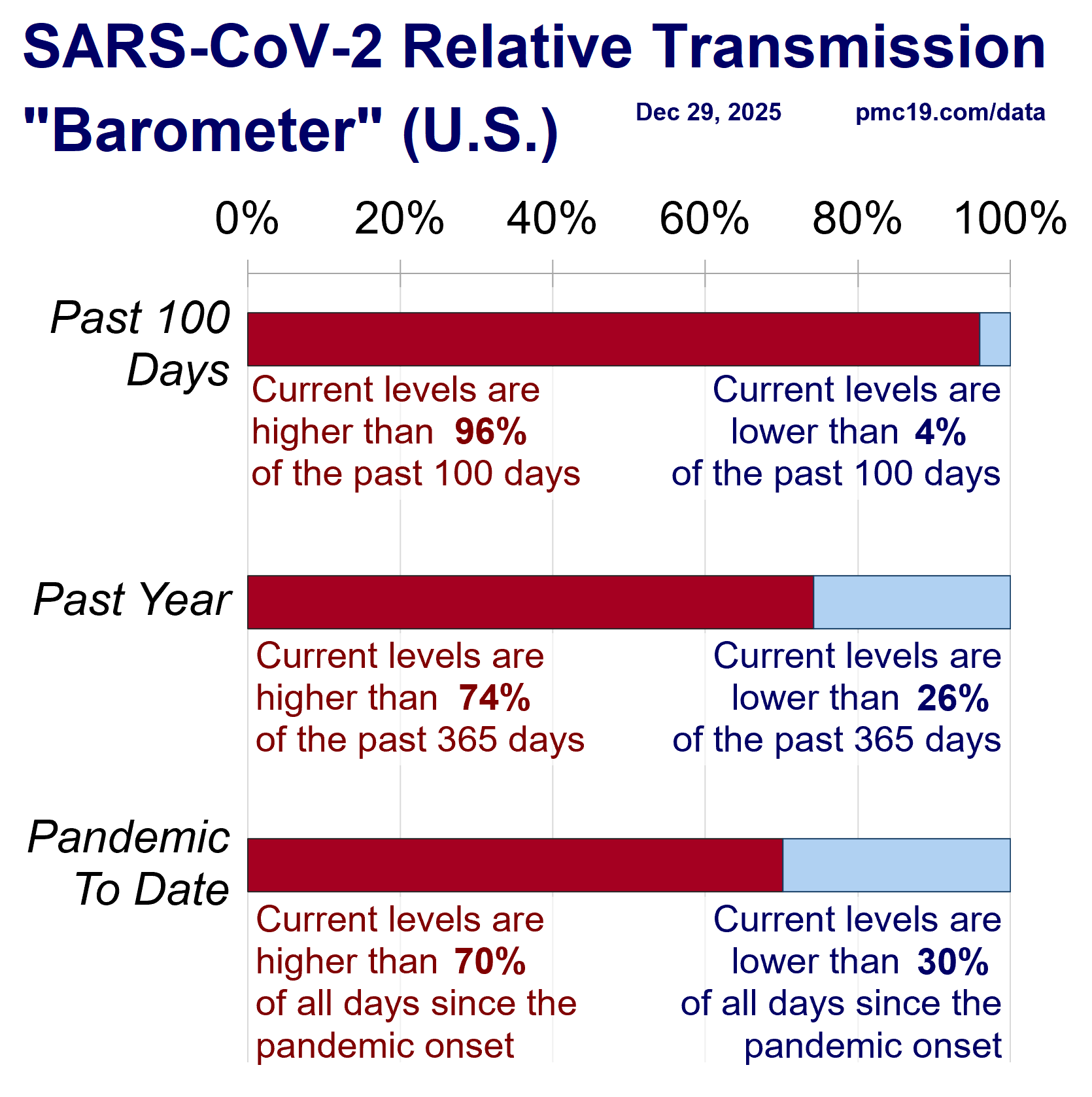 The U.S. is in the middle of a 12th COVID wave. The most recent reliable data are through December 20 and show moderate relative levels, but CDC, Biobot, and PMC forecasts indicate rising transmission through at least December 27, perhaps longer. This discrepancy between known and forecasted levels suggests that many people will get "surprise" SARS-CoV-2 infections over the next several weeks. If transmission is like last year, it may remain near-peak for several weeks.
