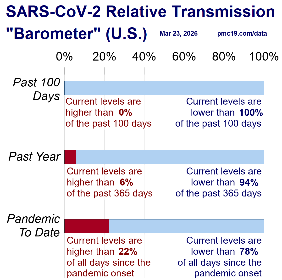 The U.S. is exiting a 12th wave of COVID-19. Transmission remains risky in absolute terms, but levels are low in most regions in the relative sense, meaning that in most places it is less risky today than during the past several months. We made several minor updates this week, described in both the Report and Appendix. You may notice a few updates to the graphics.